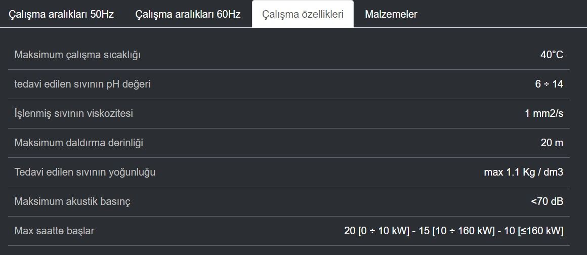 Her model uygulama türüne en uygun malzemeleri kullanabilme imkanı sayesinde, görev noktasında optimum performans, düşük enerji kullanımı ve yüksek güvenilirlik sağlaması için seçilen bir motor-hidrolik kombinasyonu mevcuttur. Ayrıca, tüm modellerde, harici sıvı girişi gerektirmeyen ve elektrikli pompanın kısmen kuru bir ortamda kullanılsa veya monte edilmiş olsa bile sürekli (S1 görevi) çalışmasına izin veren kuru versiyonu da mevcuttur.